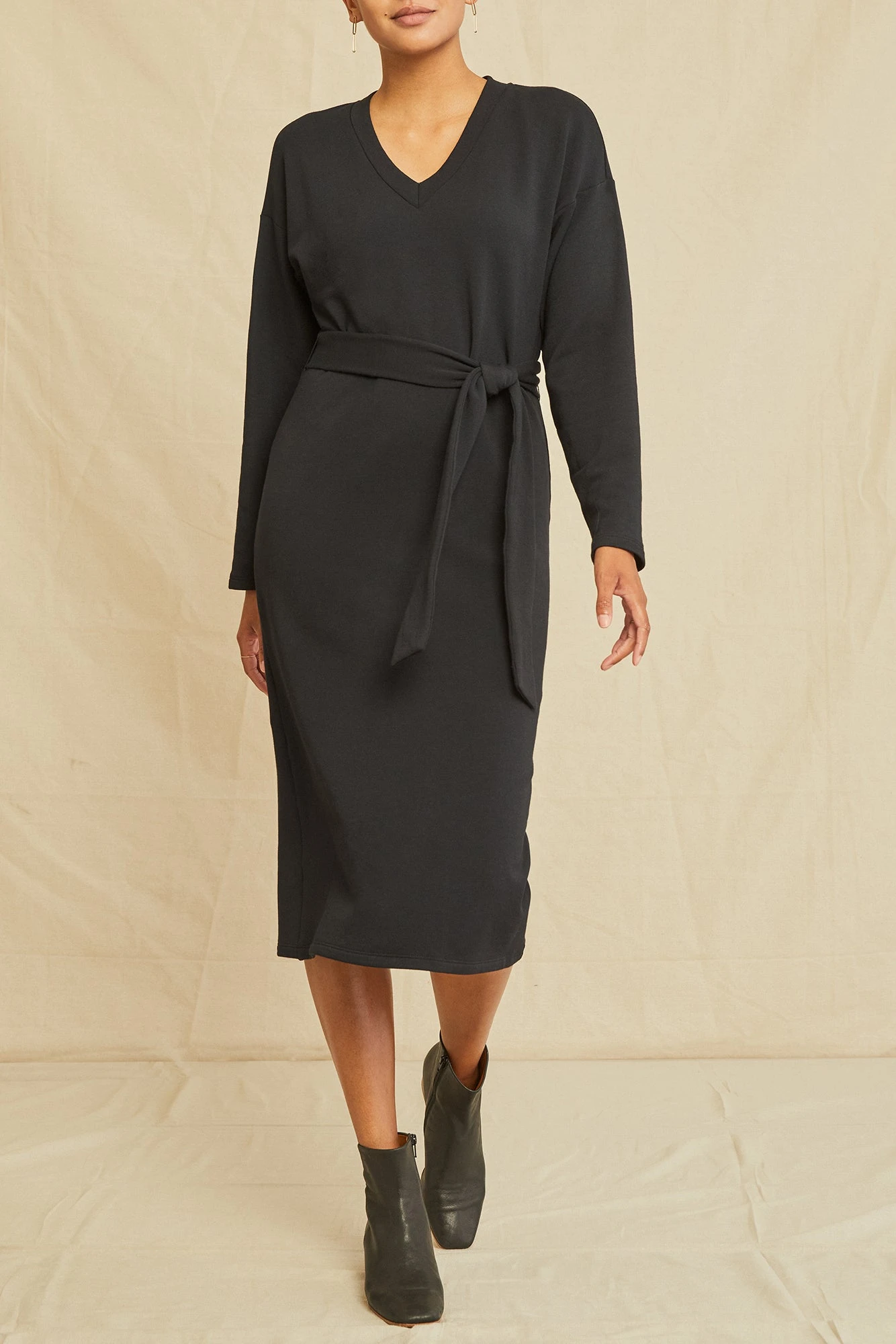 Long sleeve midi dress with a v-neckline and adjustable waist tie. Made in our coziest luxe fleece, a blend of modal and organic cotton.