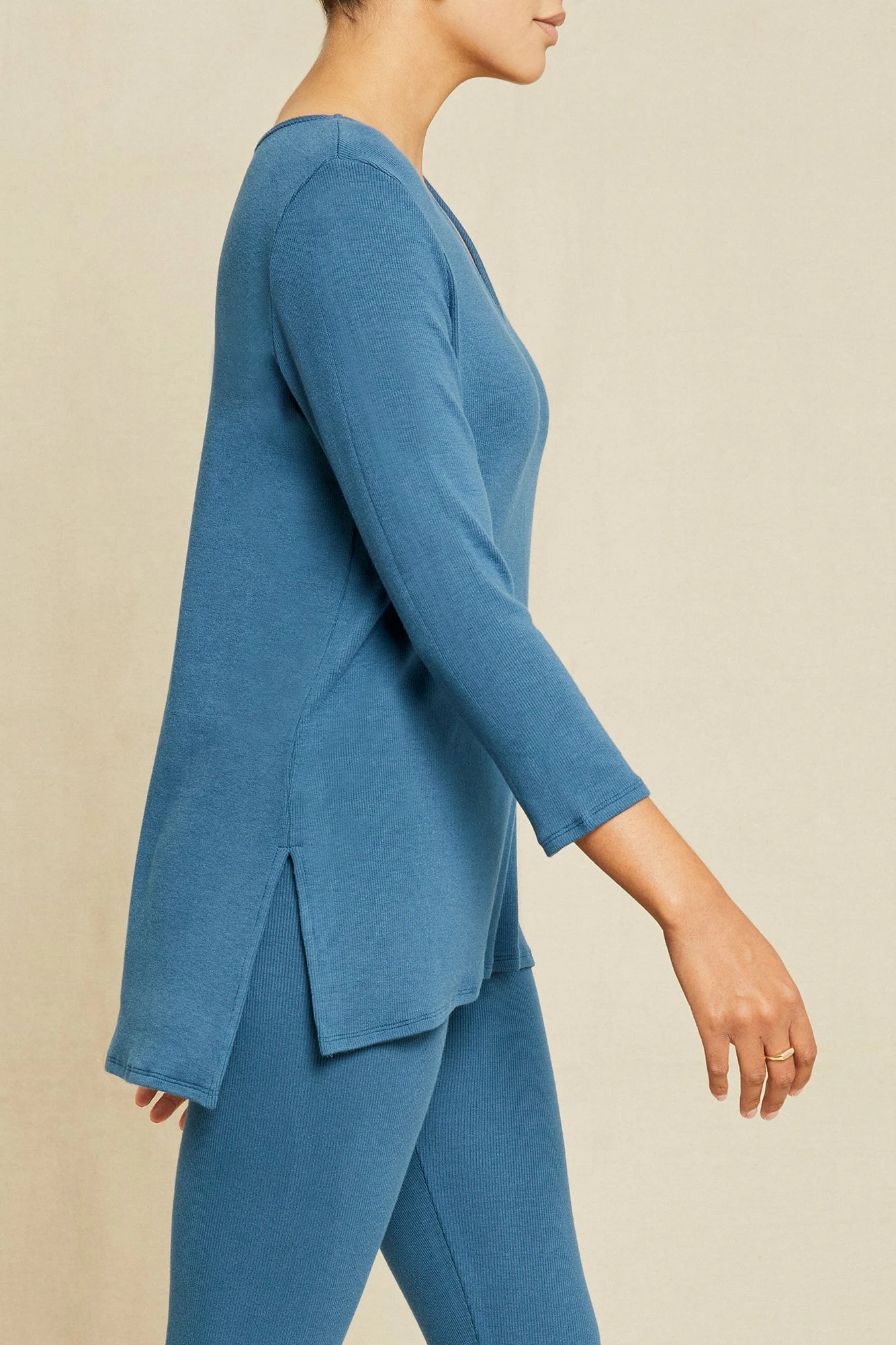 Flowy t-shirt with 3/4 length sleeves, a v-neckline, and side slits. Made in our silky smooth Dream Rib, this is the ultimate lounge piece.
