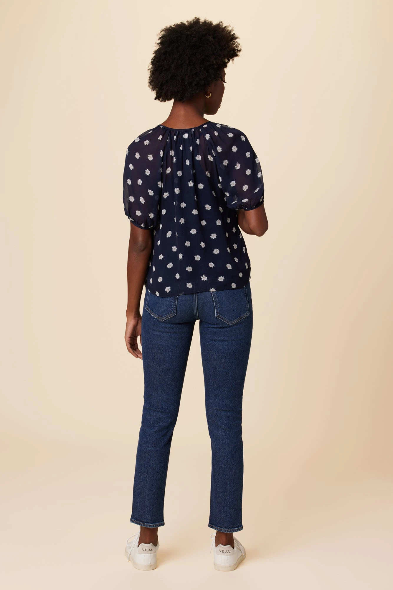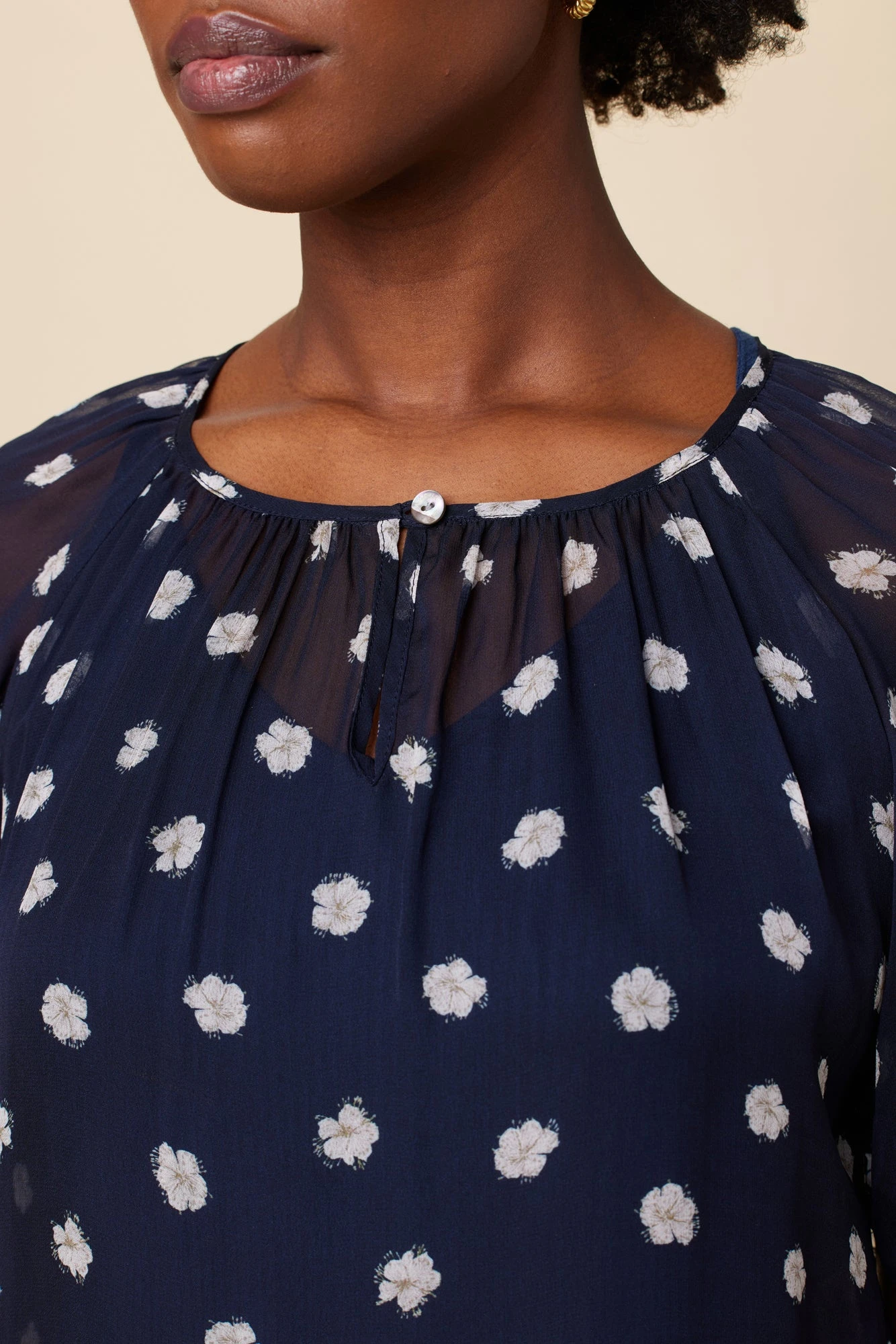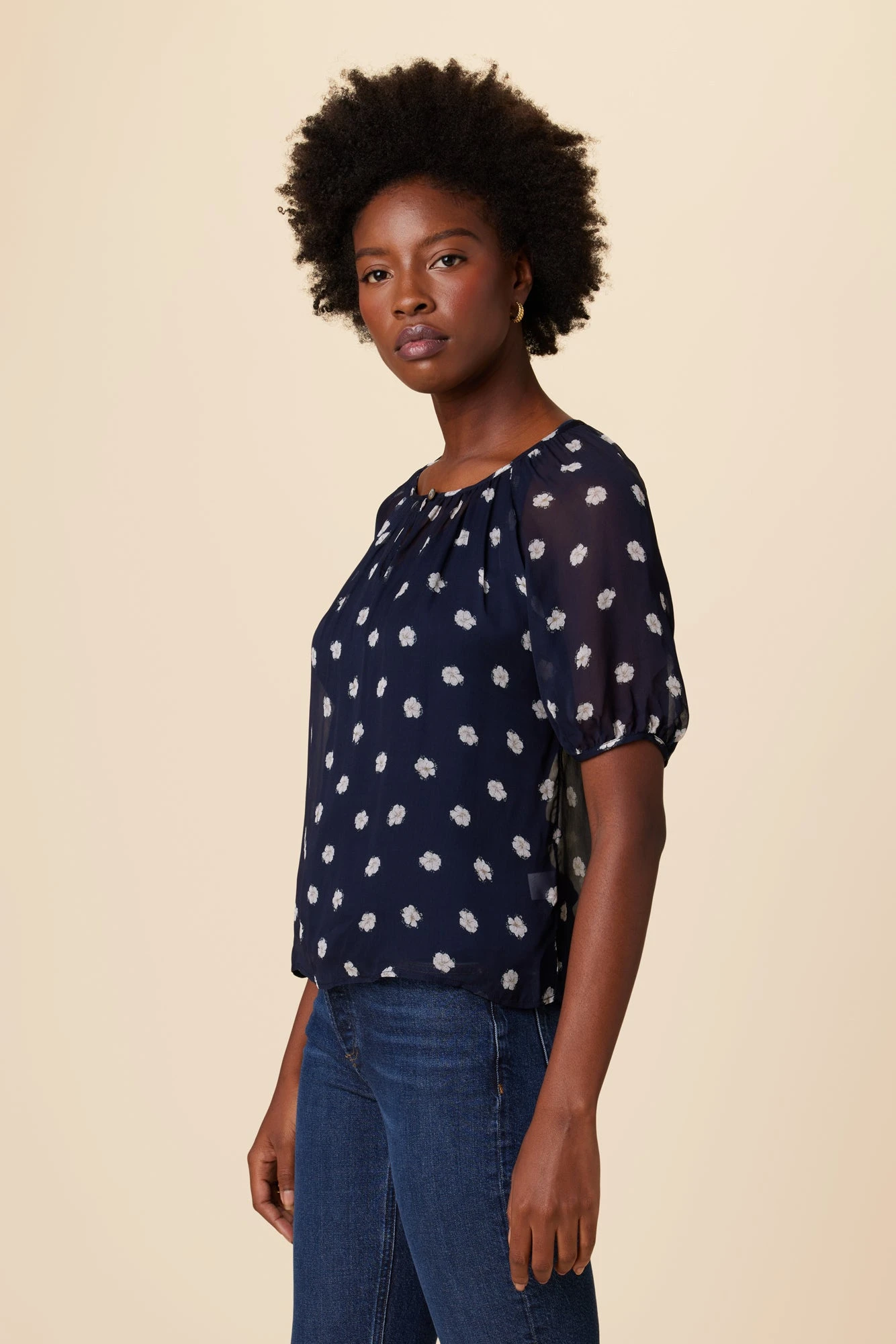 Airy chiffon blouse featuring elbow length puff sleeves, and loop and button closure at front neck. Please note this blouse is semi-sheer, we recommend wearing a nude or dark tank underneath for fuller coverage.