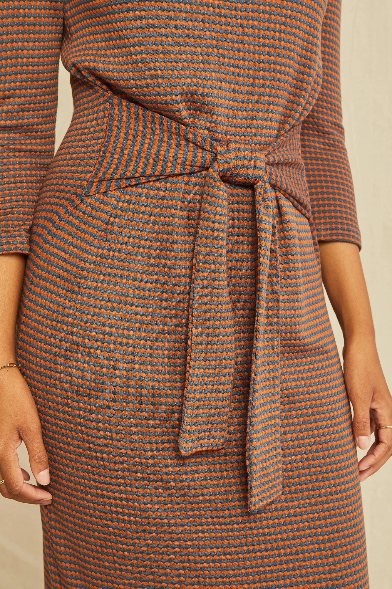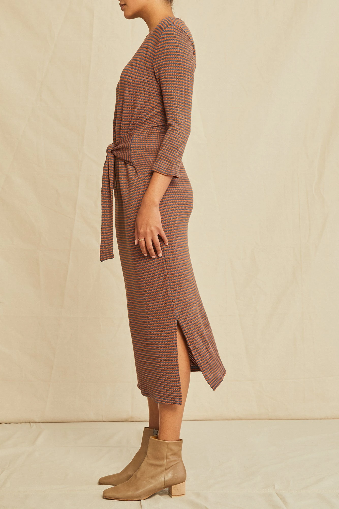 3/4 sleeve midi dress with a crewneck, tie waist detail, and relaxed fit. Made in our soft and lightweight scallop knit, a blend of recycled viscose and organic cotton.