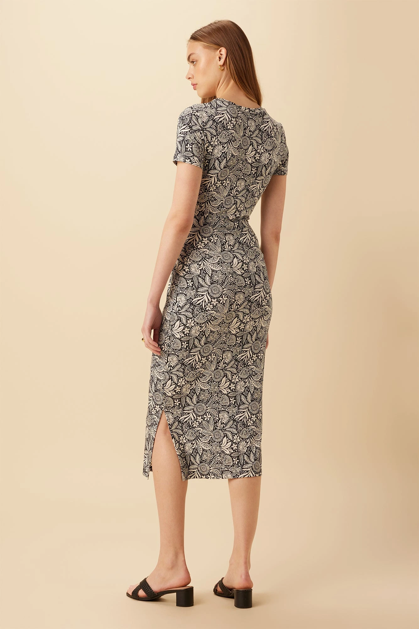 - Short sleeve midi length dress that is as comfortable as it is flattering.