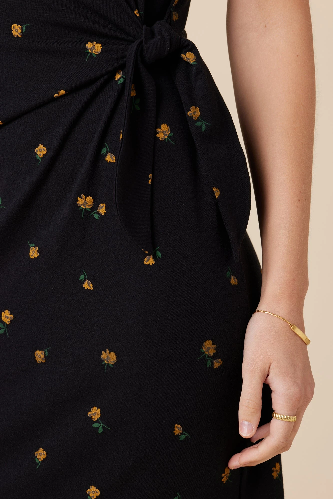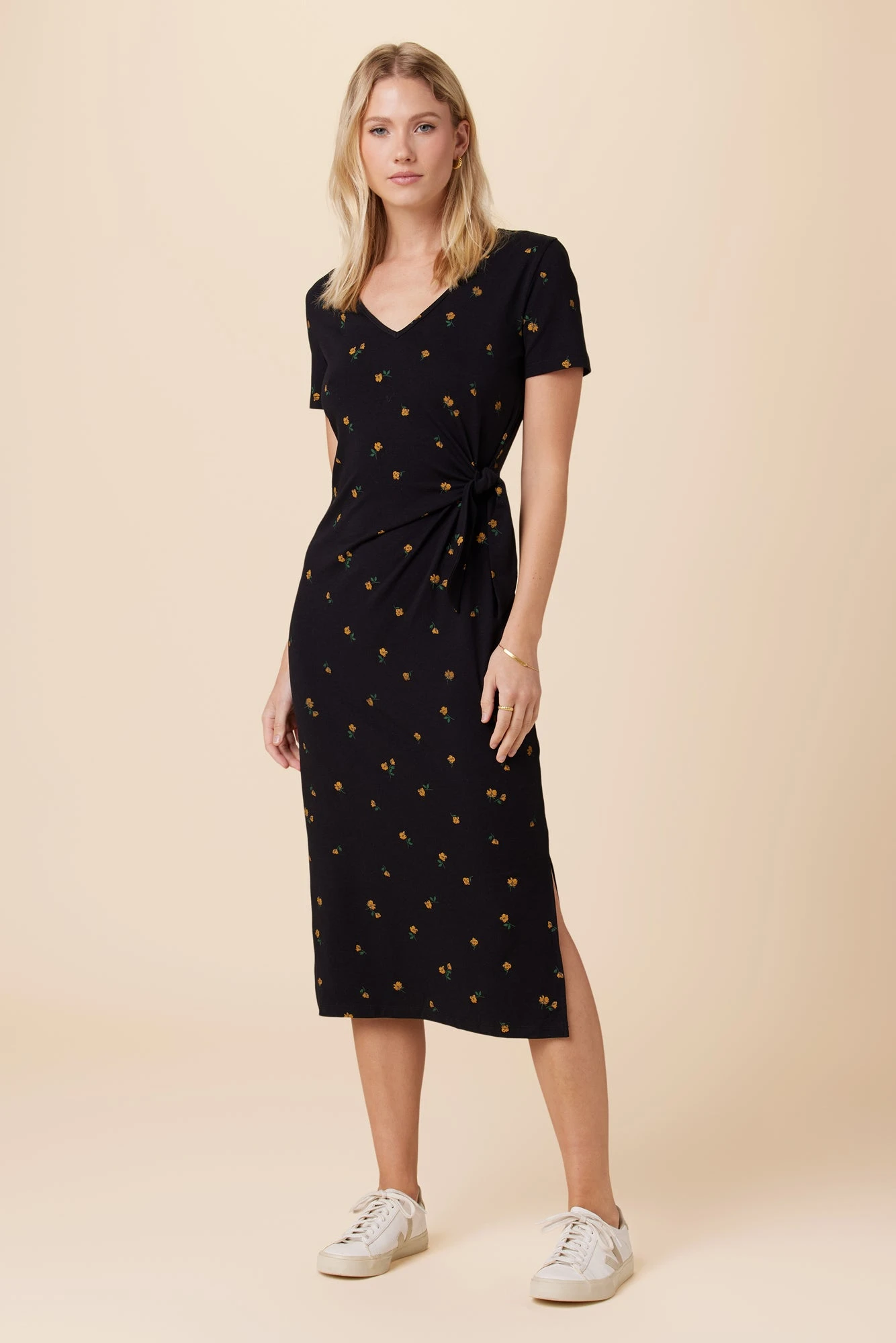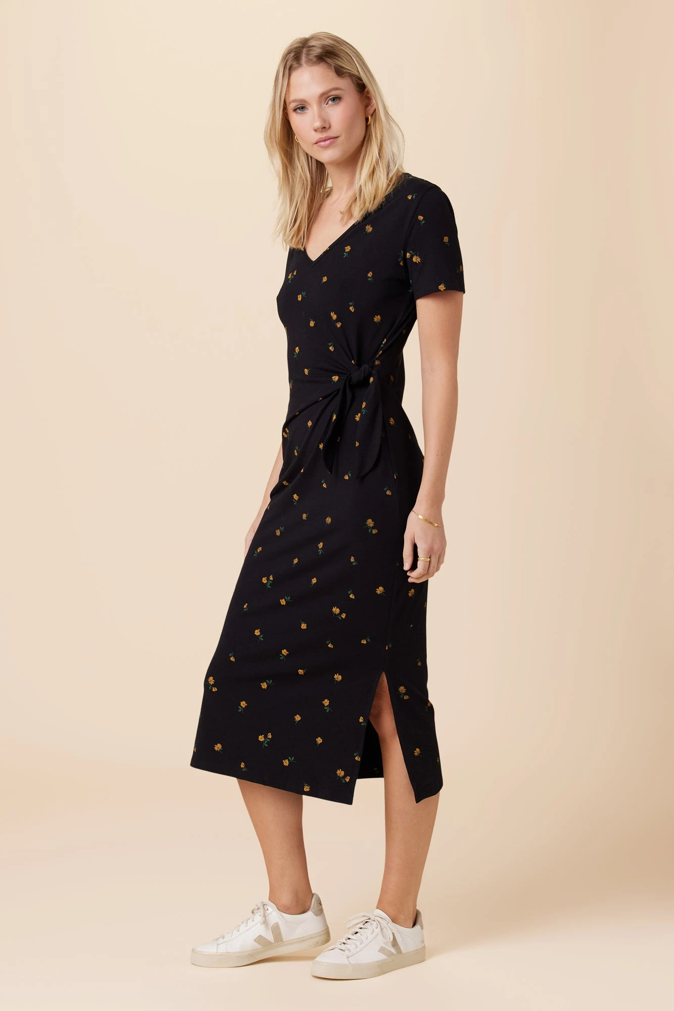 - This short sleeve midi dress features a v-neck, tie detail at the side waist, and bottom side slits.