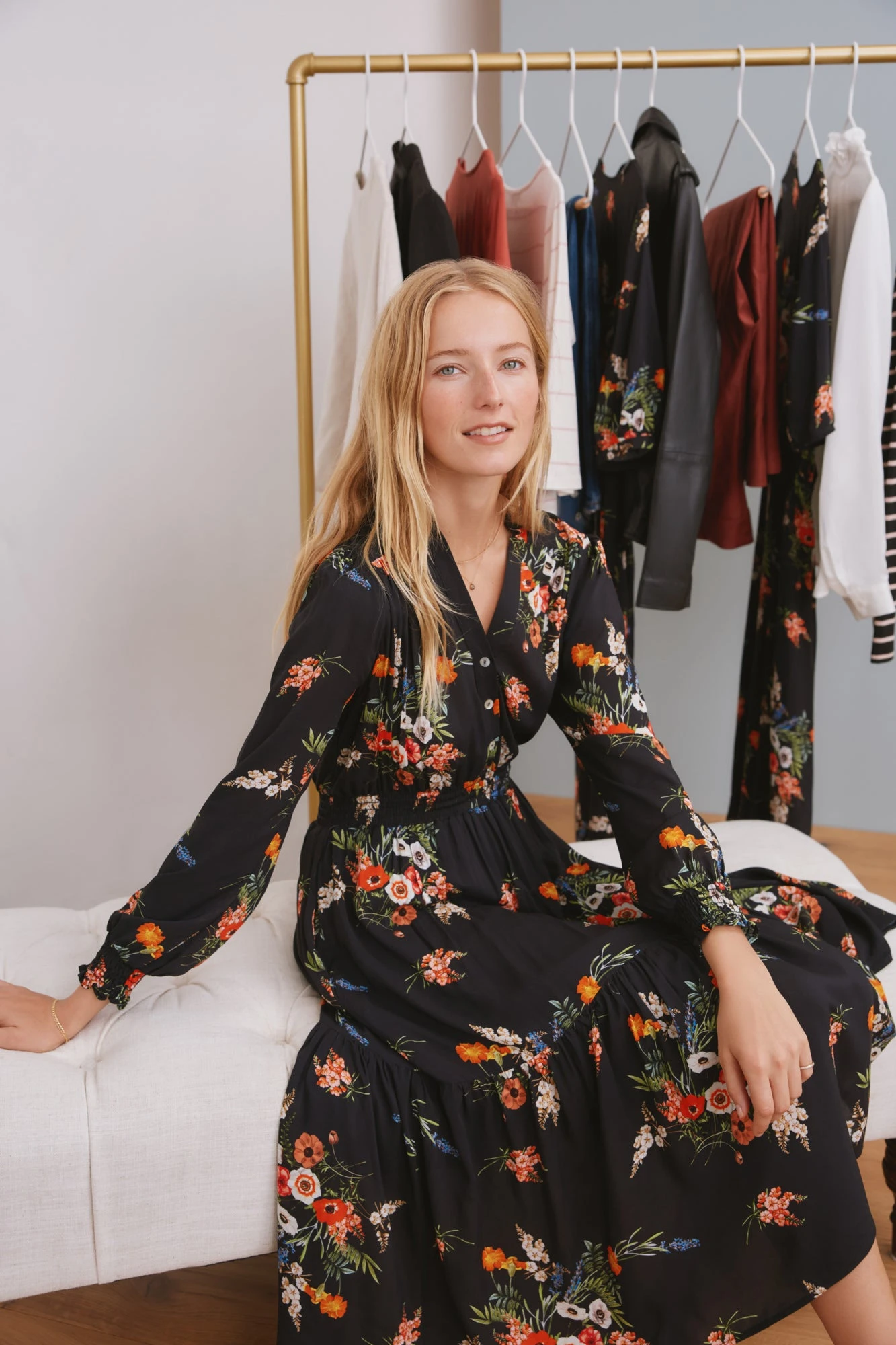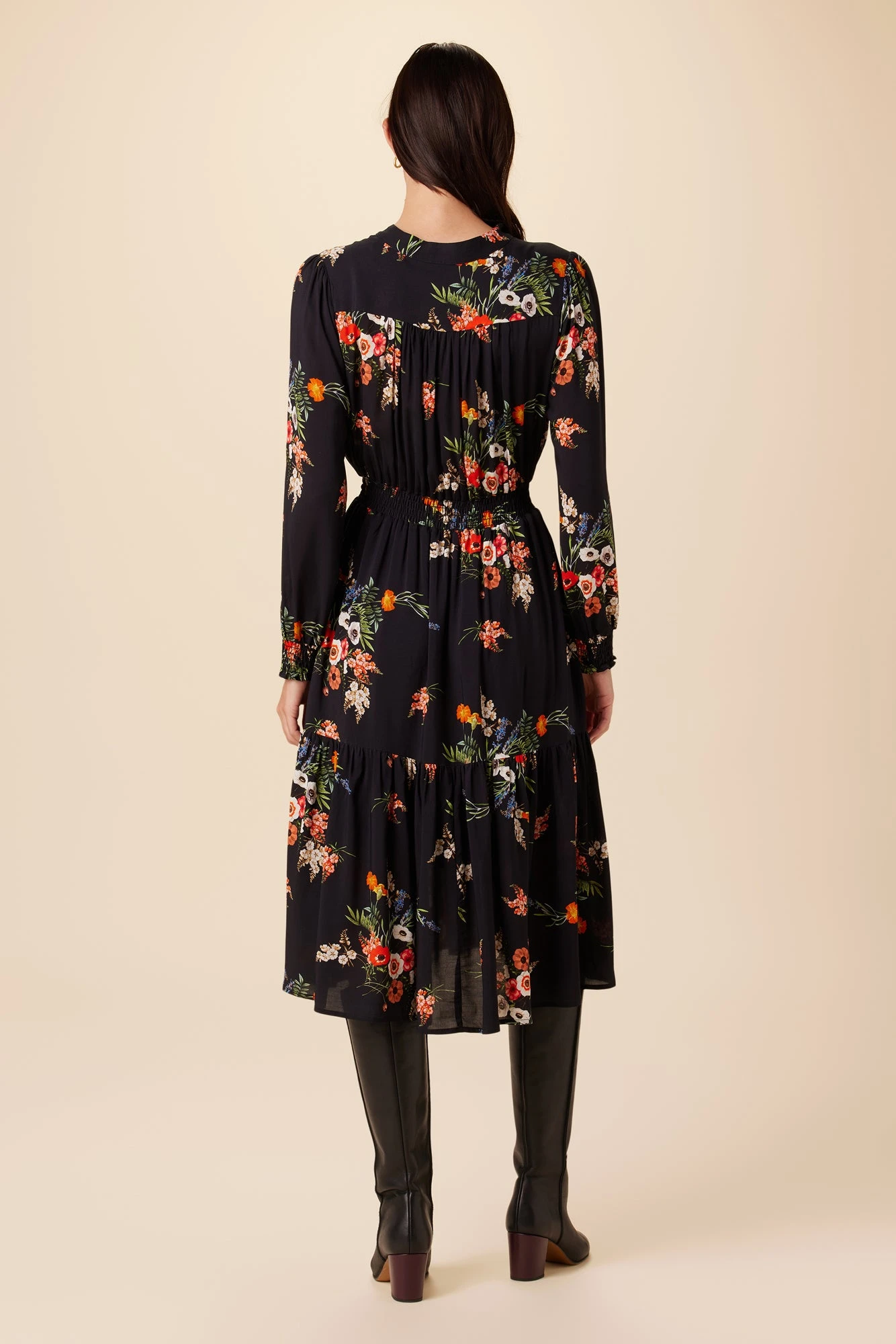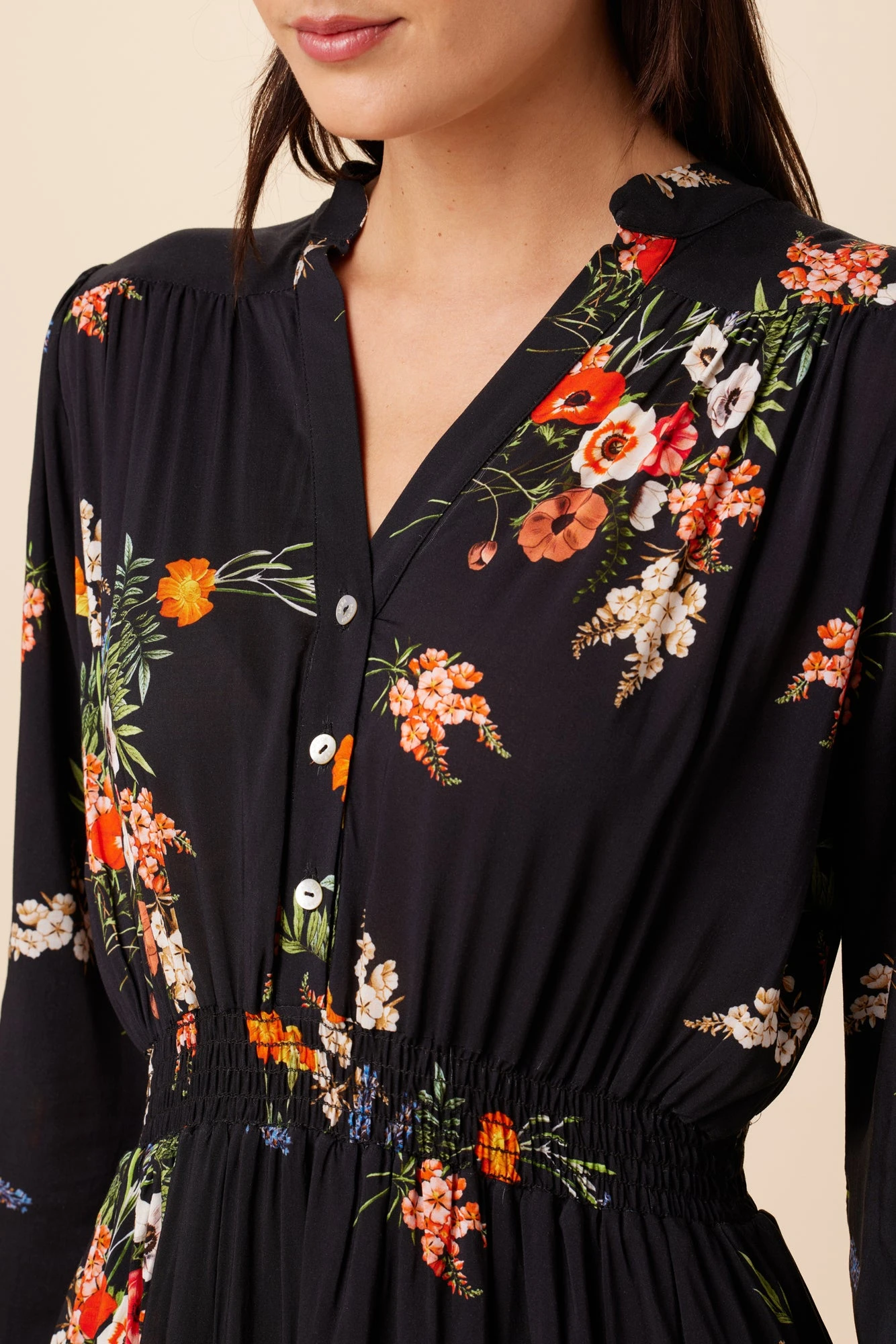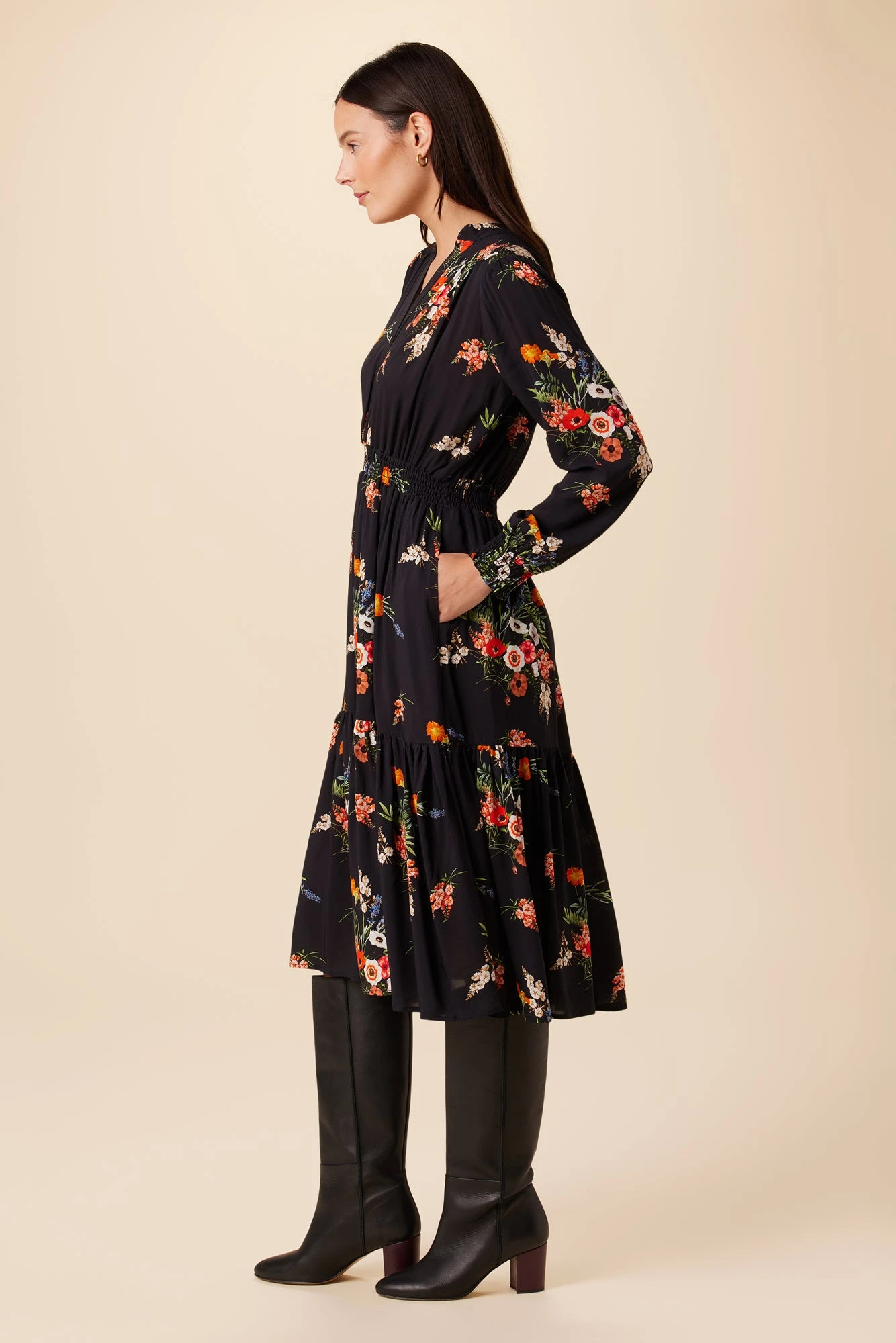 A long sleeve shirt dress, smocked waist and cuff detail with flounce skirt and an a-line button detail on front placket down to waist, made in our sustainable ECOVERO™ Viscose fabric.