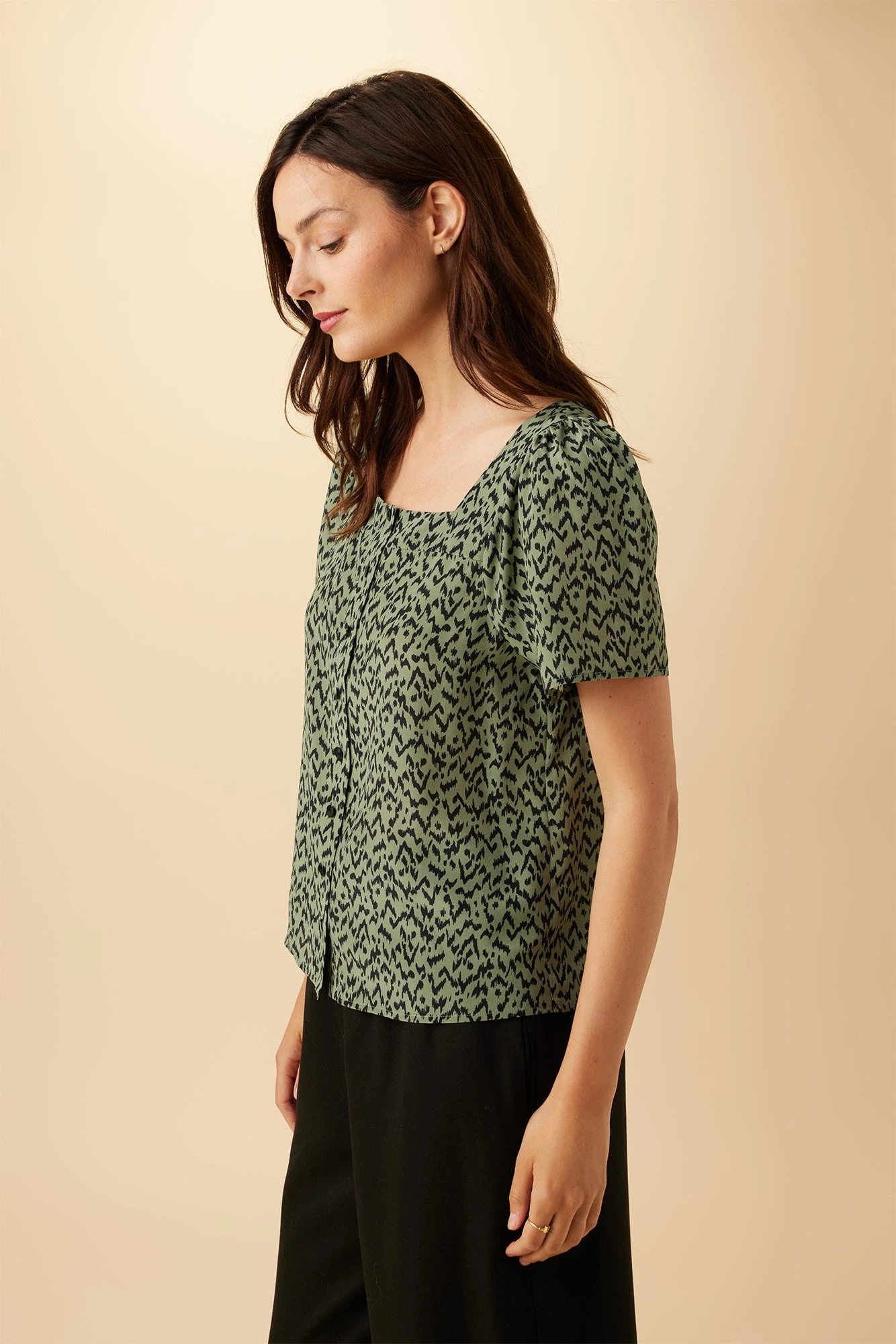 - Short sleeve washable silk blouse featuring front placket with buttons, square neck line, and straight hem.