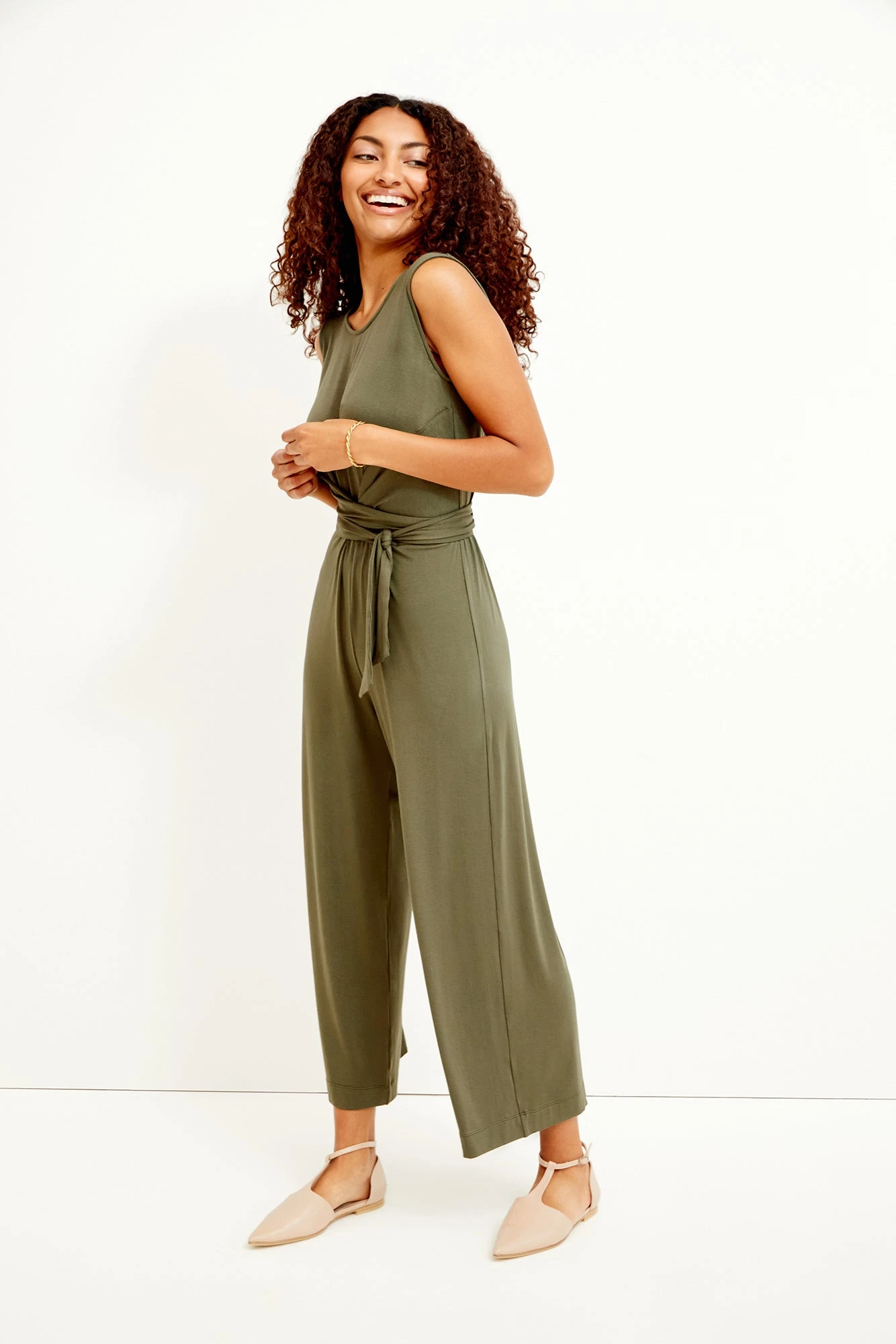 Sleeveless jumpsuit with an adjustable wrap tie at the waist, open back, and cropped leg. A true wardrobe staple, made from our softest signature beechwood blend.