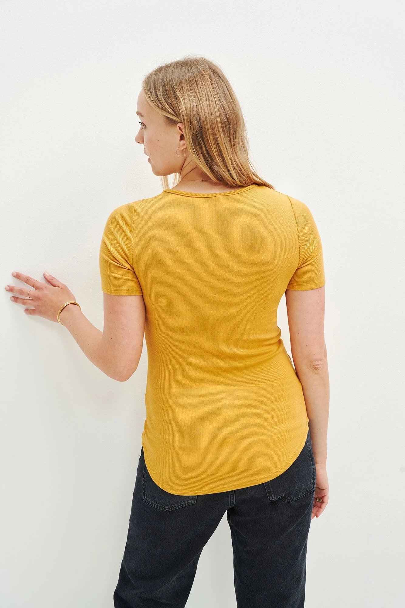 Short sleeve tee with a scoop neck and shirt-tail hem. A great layering piece made from our lightweight, super soft Dream Rib fabric.
