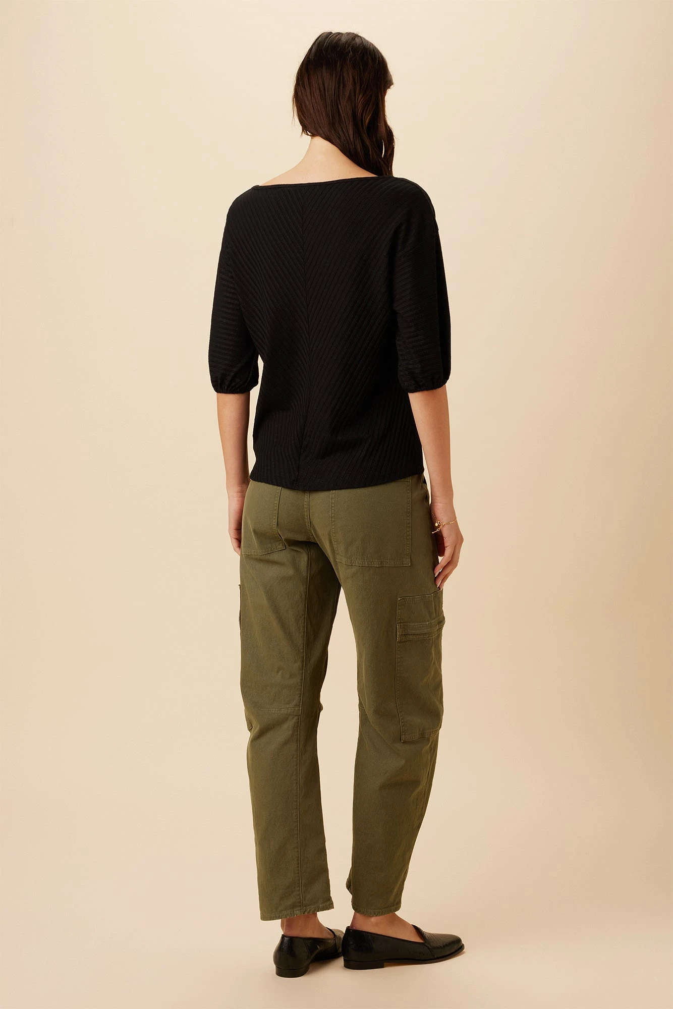 - Ribbed v-neck top featuring voluminous short sleeves with elastic.