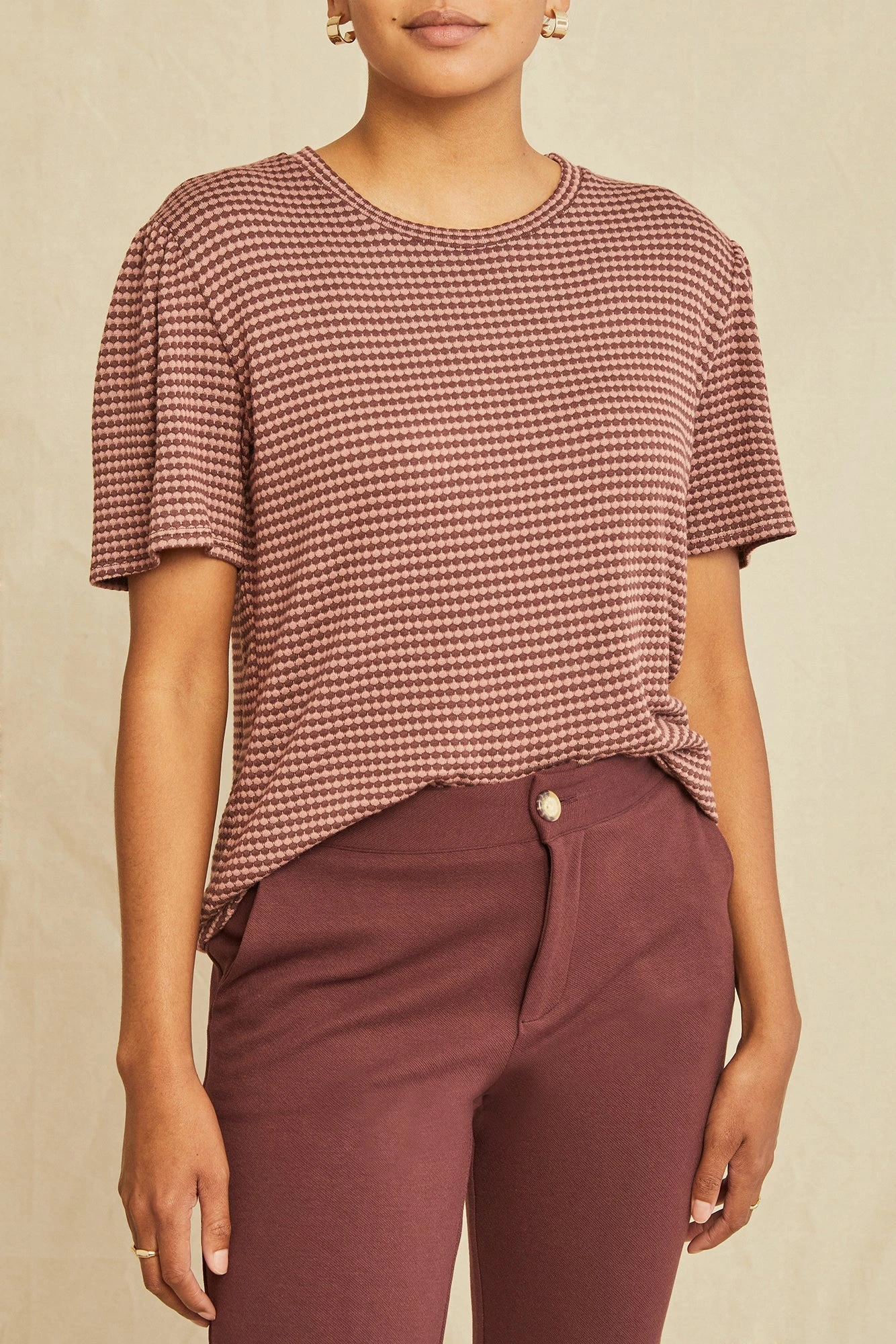 Crewneck tee detailed with pleating at the sleeves for a little added volume. Made from our lightweight scallop knit, a blend of modal and organic cotton.