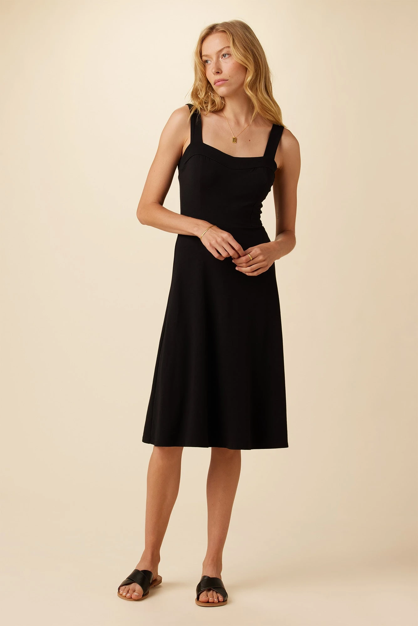 Midi length dress featuring slim fitting bodice with seam details and an a-line skirt. Made in our luxe Reverie Knit fabric, this easy dress is as comfortable as it is flattering.