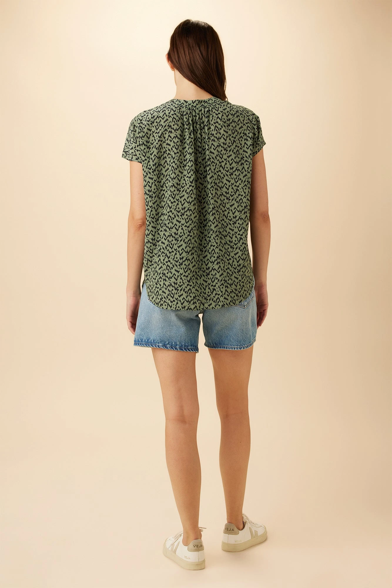 - Featuring a v-neck opening with single-button closure, short sleeves, and a relaxed fit.