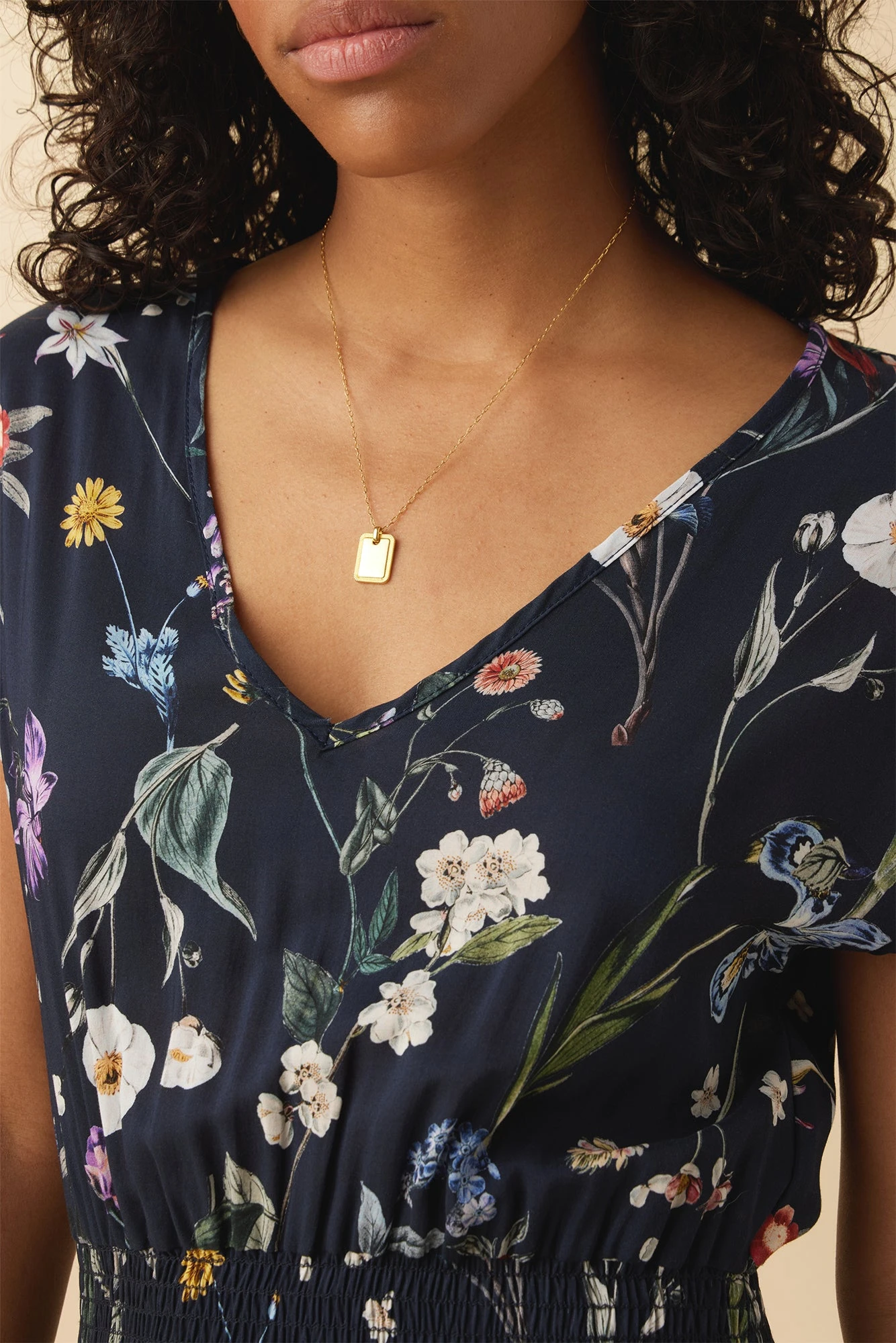 - Casual floral maxi dress featuring smocked detail at the waist, long midi length, dropped shoulder, v-neckline.