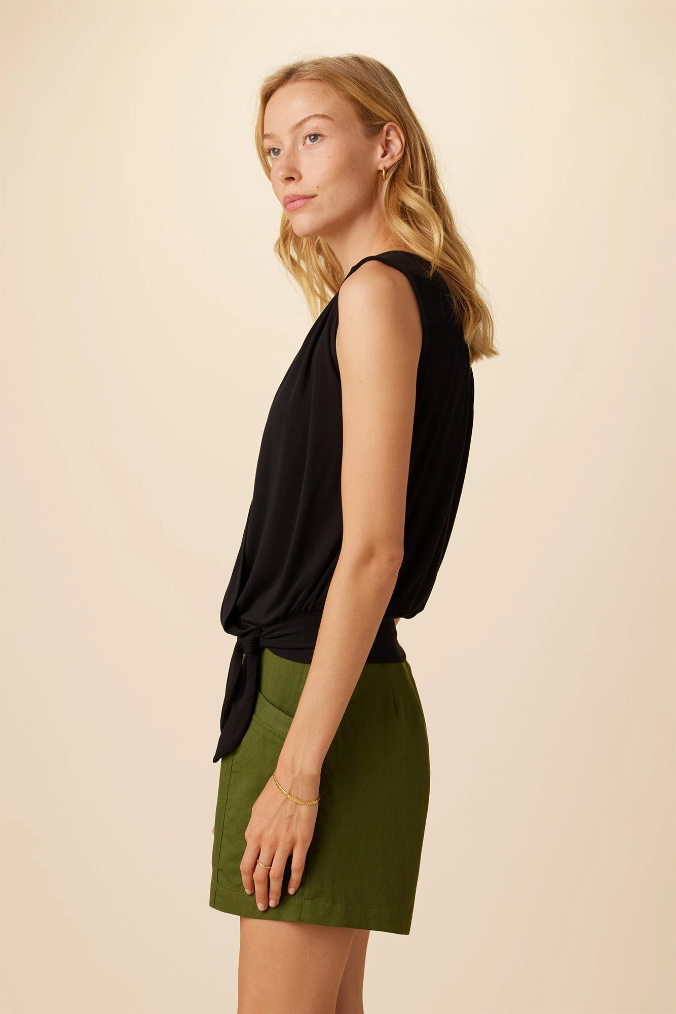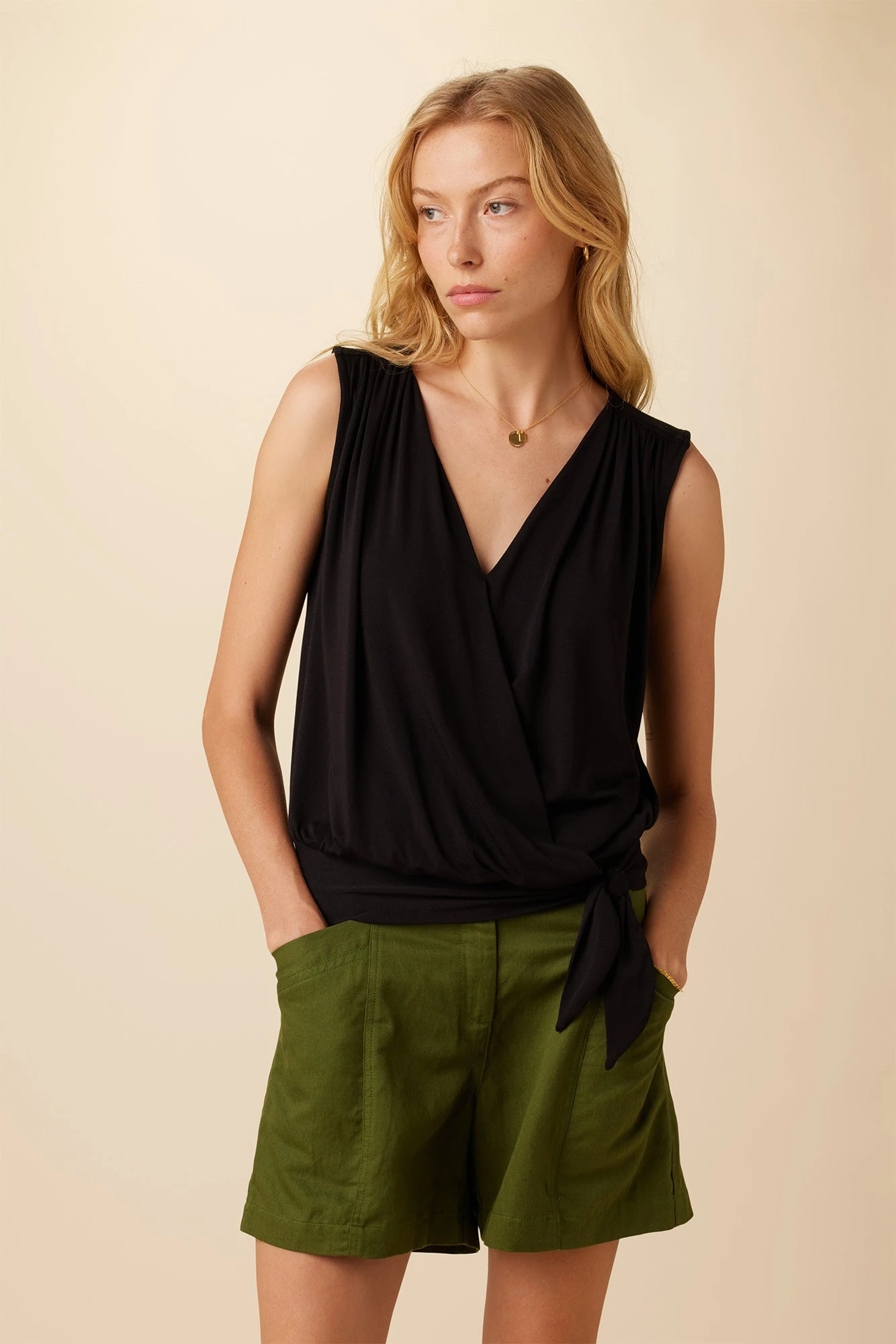 Sleeveless wrap top featuring v-neckline, gathering at shoulders, back yoke and a tie front attached to band, made from our signature super-soft Dream Knit fabric that is so comfortable, you’ll want to wear it everyday. We suggest pairing this top with your favorite mid or high-rise bottoms.